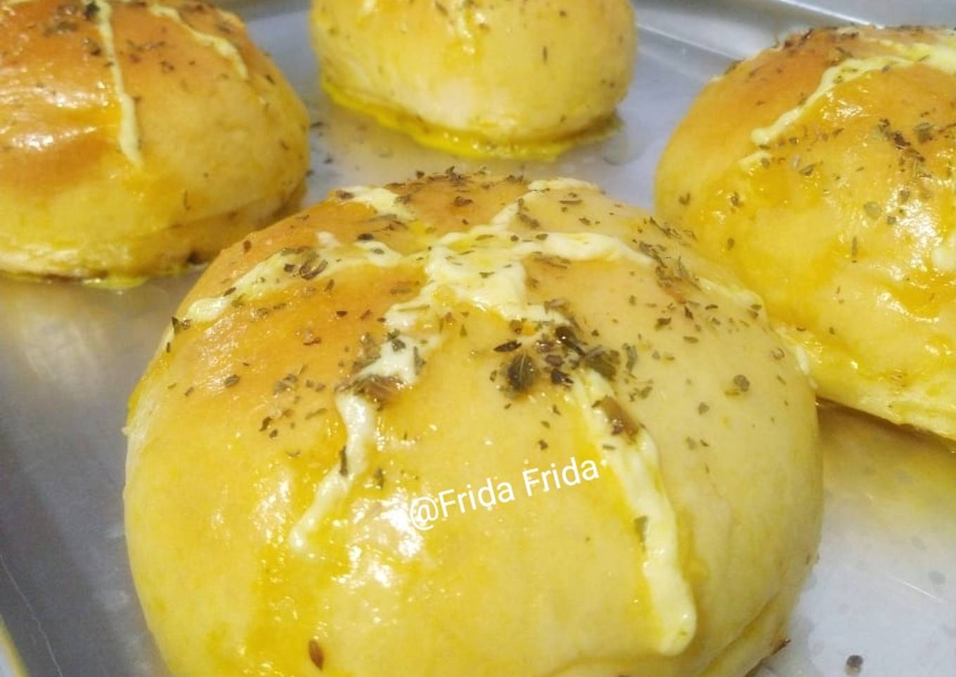 - Belah roti Bun, lalu Olesi dengan garlic butter di sela2 dan di permukaan roti